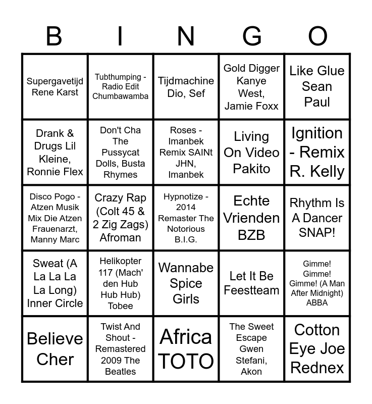 This bingo card has 92 words: Mambo No. 5 - Lou Bega, Wake Me up Before You Go-Go Wham!, Africa TOTO, Take on Me a-ha, Crazy In Love - Beyonce, JAY-Z, Karma Chameleon - Culture Club, I Wanna Dance with Somebody (Who Loves Me) Whitney Houston, Believe Cher, Forever Young - 2019 Remaster Alphaville, Flashdance...What a Feeling - Radio Edit Irene Cara, All That She Wants Ace of Base, I'm Coming Out Diana Ross, Free!, Living On Video Pakito, Shined On Me - Radio Edit Praise Cats, Andrea Love, Like Glue Sean Paul, Tijdmachine Dio, Sef, Dom, Lomp & Famous The Opposites, Dio, Willie Wartaal, Chlorine Twenty One Pilots, Old Town Road (feat. Billy Ray Cyrus) - Remix Lil Nas X, Billy Ray Cyrus, Shooting Stars Bag Raiders, Alors on danse Stromae, 99 Luftballons Nena, Sterrenstof De Jeugd Van Tegenwoordig, Helikopter 117 (Mach' den Hub Hub Hub) Tobee, Don't Cha The Pussycat Dolls, Busta Rhymes, Womanizer Britney Spears, Cotton Eye Joe Rednex, Een Echte Faberyayo, Feel It Still Portugal. The Man, Twist And Shout - Remastered 2009 The Beatles, Wannabe Spice Girls, 7 Days Craig David, Kids MGMT, Tubthumping - Radio Edit Chumbawamba, Heads Will Roll - A-Trak Remix Yeah Yeah Yeahs, A-Trak, Boom, Boom, Boom, Boom!! Vengaboys, Sultans Of Swing Dire Straits, Roses - Imanbek Remix SAINt JHN, Imanbek, Let It Be Feestteam, Disco Pogo - Atzen Musik Mix Die Atzen Frauenarzt, Manny Marc, Sweat (A La La La La Long) Inner Circle, Rhythm Is A Dancer SNAP!, Without Me Eminem, Hypnotize - 2014 Remaster The Notorious B.I.G., Money to Burn T.O.K, Lose Yourself to Dance (feat. Pharrell Williams) Daft Punk, Pharrell Williams, Le Freak - 2018 Remaster CHIC, Superstition - Single Version Stevie Wonder, Paradise By the Dashboard Light Meat Loaf, Give It Up KC & The Sunshine Band, Don't You Want Me The Human League, Feesttent Kraantje Pappie, MC Jiggy Djé, Blue Monday '88 New Order, CH!PZ In Black (Who You Gonna Call) Chipz, Music For You - MF Stacy Kidd, Matthew Yates, Ice Mike L., Pursuit Of Happiness - Extended Steve Aoki Remix (Explicit) Kid Cudi, MGMT, Ratatat, Steve Aoki, Drank & Drugs Lil Kleine, Ronnie Flex, Young, Wild & Free (feat. Bruno Mars) Snoop Dogg, Wiz Khalifa, Bruno Mars, Crazy Rap (Colt 45 & 2 Zig Zags) Afroman, Viben K-Liber, Candy Shop 50 Cent, Olivia, Pump It Black Eyed Peas, Drop It Like It's Hot Snoop Dogg, Pharrell Williams, Hollaback Girl Gwen Stefani, The Sweet Escape Gwen Stefani, Akon, Sweet Caroline - Party Remix DJ Ãtzi, Temperature Sean Paul, Lonely Akon, Johnny Däpp Lorenz Büffel, Dikke Lul Dikke Lul Band, Ik Moet Zuipen! PartyFriex, Schorre Chef, Gold Digger Kanye West, Jamie Foxx, Love Generation Bob Sinclar, Gary Pine, Fire Burning Sean Kingston, SOS Rihanna, Gimme! Gimme! Gimme! (A Man After Midnight) ABBA, We Are Your Friends - Justice Vs Simian Justice, Simian, Million Voices - Radio Edit Otto Knows, Bonkers Dizzee Rascal, Armand Van Helden, Need In Me Flashmob, Echte Vrienden BZB, Supergavetijd Rene Karst, The Bomb (These Sounds Fall Into My Mind) The Bucketheads, Stupidisco (Radio Edit) Junior Jack, Shined On Me Praise Cats, Andrea Love, E-Smoove, Freed From Desire Gala, Inspector Norse Todd Terje, Janice Skip Mahoney, Gas Op Die Lollie FeestDJRuud, Ignition - Remix R. Kelly and Informer Snow.
