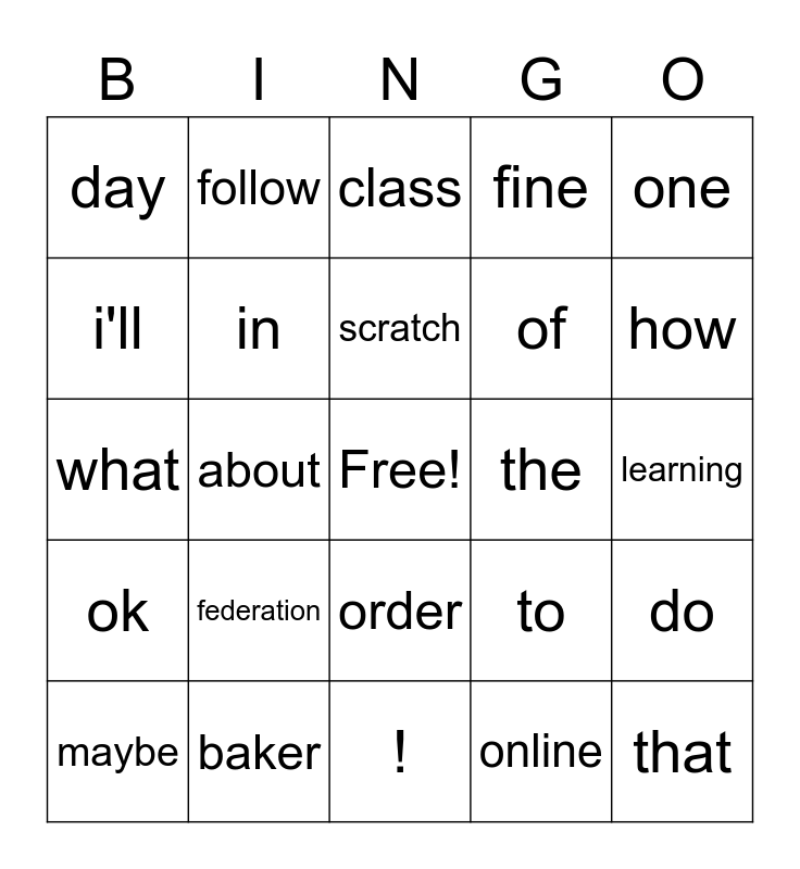 This bingo card has a free space and 24 words: federation, baker, scratch, maybe, one, day, i'll, follow, the, order, of, what, to, do, in, online, learning, class, how, about, that, ok, fine and !.