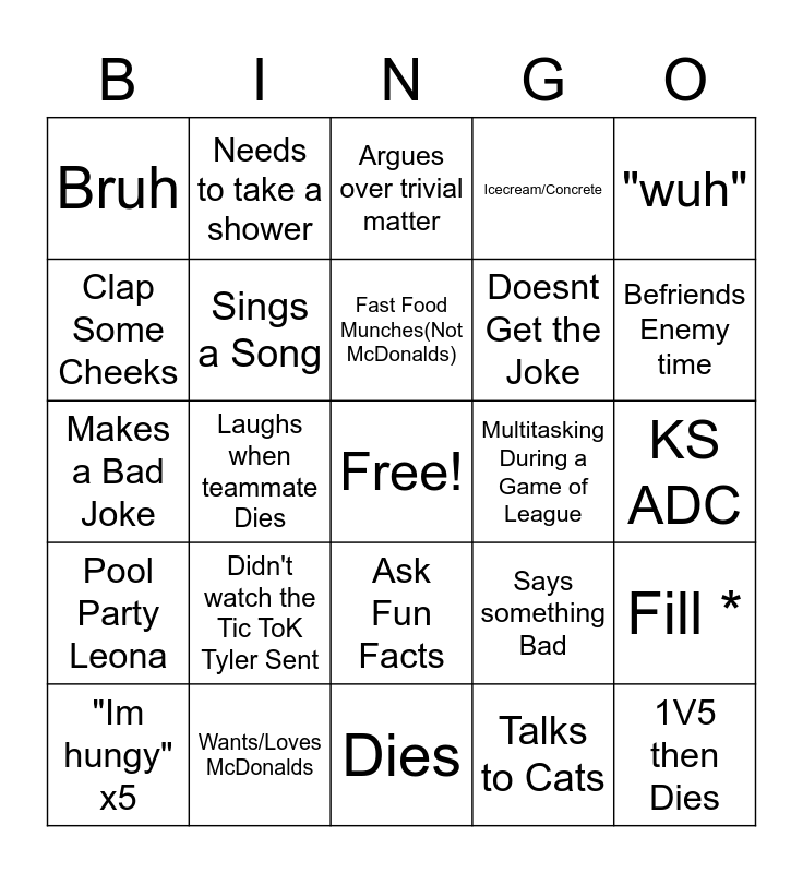 This bingo card has a free space and 24 words: Didn't watch the Tic ToK Tyler Sent, Wants/Loves McDonalds, Fast Food Munches(Not McDonalds), "Im hungy" x5, "wuh", Bruh, Clap Some Cheeks, Needs to take a shower, Multitasking During a Game of League, Ask Fun Facts, Doesnt Get the Joke, Makes a Bad Joke, Says something Bad, Fill *, Sings a Song, Talks to Cats, KS ADC, Argues over trivial matter, Befriends Enemy time, Laughs when teammate Dies, 1V5 then Dies, Pool Party Leona, Icecream/Concrete and Dies.