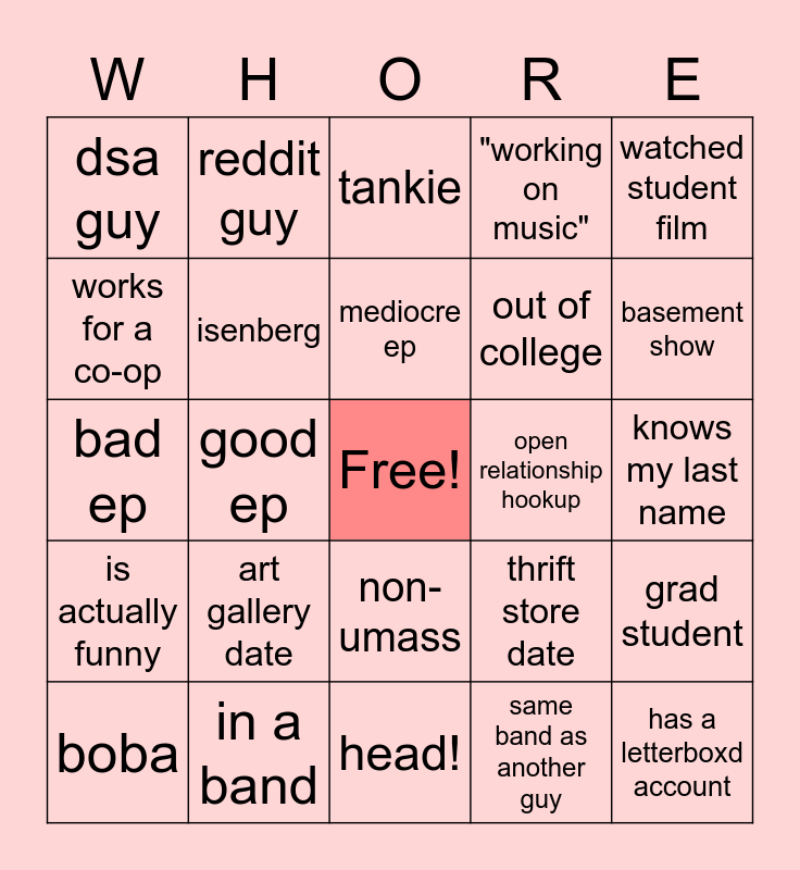 This bingo card has a free space and 24 words: art gallery date, in a band, mediocre ep, boba, watched student film, dsa guy, works for a co-op, reddit guy, open relationship hookup, non-umass, out of college, bad ep, thrift store date, grad student, isenberg, same band as another guy, knows my last name, tankie, basement show, good ep, has a letterboxd account, is actually funny, "working on music" and head!.
