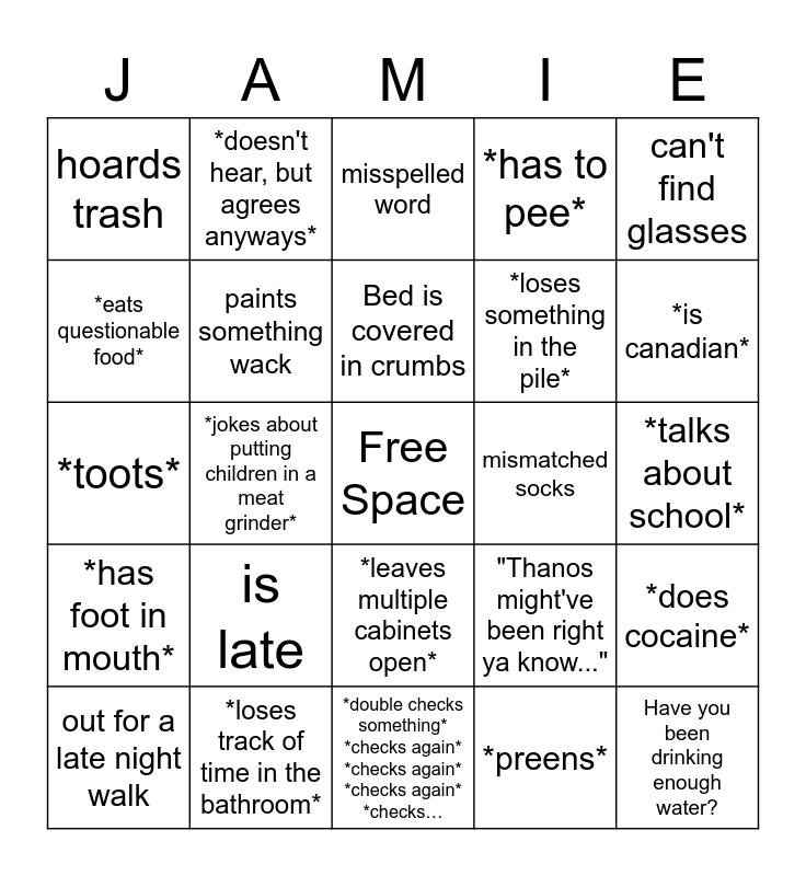 This bingo card has a free space and 24 words: is late, *loses track of time in the bathroom*, Bed is covered in crumbs, out for a late night walk, can't find glasses, hoards trash, *eats questionable food*, *doesn't hear, but agrees anyways*, mismatched socks, *leaves multiple cabinets open*, *loses something in the pile*, *toots*, "Thanos might've been right ya know...", *does cocaine*, paints something wack, *preens*, *talks about school*, misspelled word, *is canadian*, *jokes about putting children in a meat grinder*, Have you been drinking enough water?, *has foot in mouth*, *has to pee* and *double checks something* *checks again* *checks again* *checks again* *checks….
