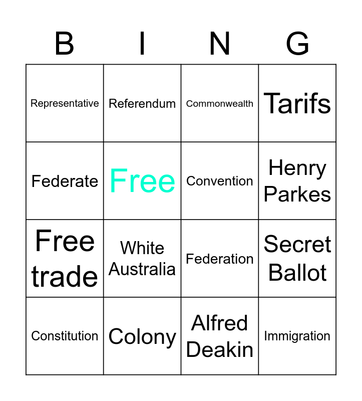 This bingo card has 16 words: Colony, Secret Ballot, Commonwealth, Representative, Free trade, Referendum, Federation, Alfred Deakin, Federate, Free, Constitution, Tarifs, White Australia, Henry Parkes, Convention and Immigration.