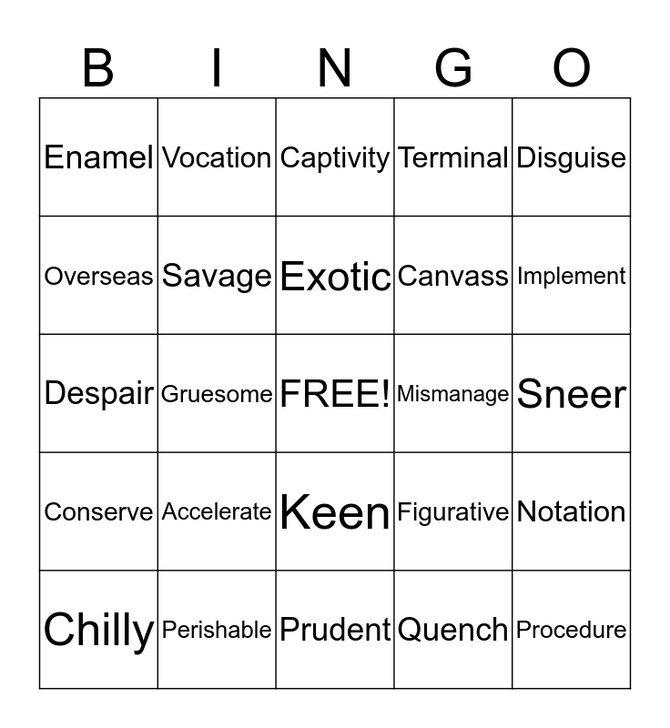 This bingo card has a free space and 24 words: Accelerate, Perishable, Exotic, Chilly, Disguise, Enamel, Overseas, Vocation, Mismanage, Keen, Canvass, Despair, Figurative, Notation, Savage, Quench, Sneer, Captivity, Implement, Gruesome, Procedure, Conserve, Terminal and Prudent.