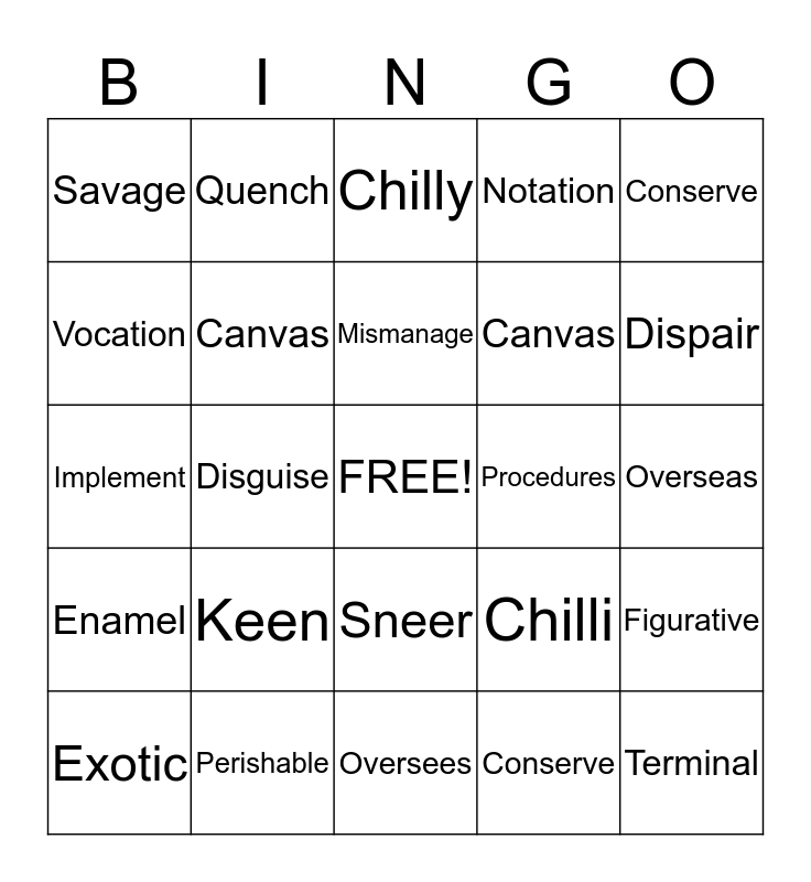 This bingo card has a free space and 24 words: Keen, Perishable, Mismanage, Exotic, Conserve, Savage, Vocation, Quench, Procedures, Sneer, Canvas, Implement, Chilli, Figurative, Canvas, Conserve, Overseas, Chilly, Dispair, Disguise, Terminal, Enamel, Notation and Oversees.