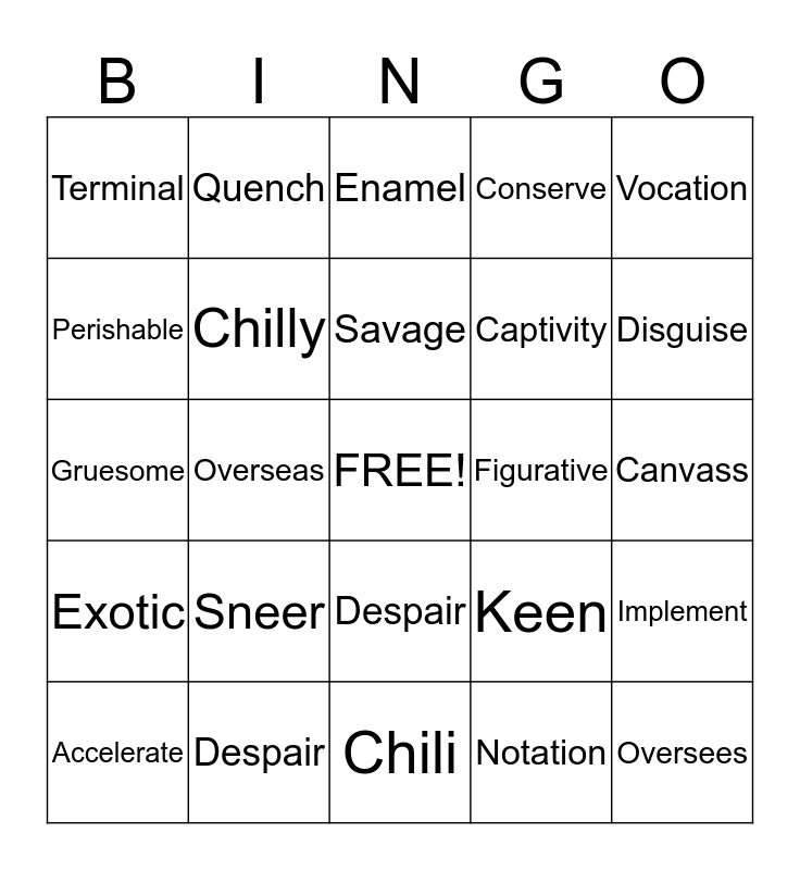 This bingo card has a free space and 24 words: Sneer, Despair, Savage, Accelerate, Vocation, Terminal, Perishable, Quench, Figurative, Despair, Captivity, Gruesome, Keen, Implement, Chilly, Notation, Canvass, Enamel, Disguise, Overseas, Oversees, Exotic, Conserve and Chili.