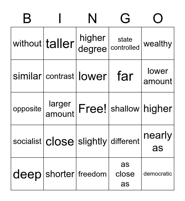 This bingo card has a free space and 24 words: close, shorter, lower, deep, wealthy, without, similar, taller, shallow, slightly, far, opposite, different, nearly as, contrast, as close as, higher, higher degree, lower amount, larger amount, democratic, socialist, state controlled and freedom.