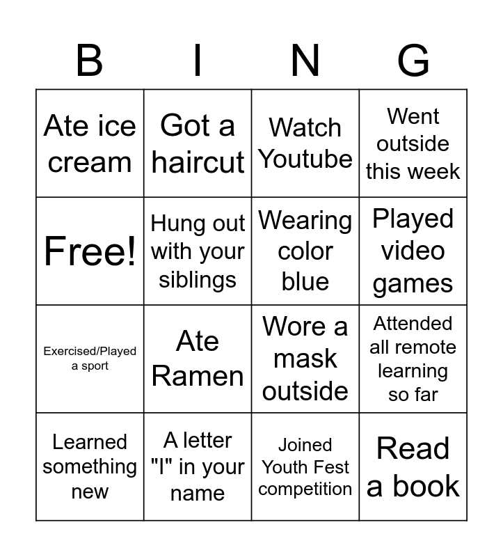 This bingo card has 16 words: A letter "I" in your name, Attended all remote learning so far, Watch Youtube, Ate ice cream, Exercised/Played a sport, Got a haircut, Wore a mask outside, Joined Youth Fest competition, Free!, Hung out with your siblings, Learned something new, Went outside this week, Ate Ramen, Played video games, Wearing color blue and Read a book.