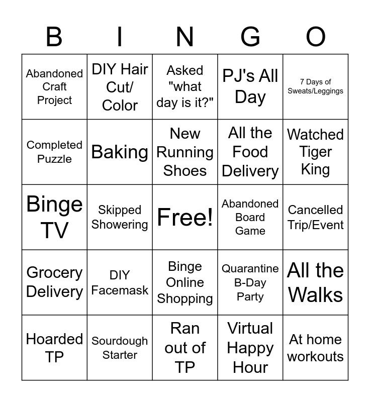 This bingo card has a free space and 24 words: DIY Facemask, Sourdough Starter, New Running Shoes, Hoarded TP, 7 Days of Sweats/Leggings, Abandoned Craft Project, Completed Puzzle, DIY Hair Cut/ Color, Abandoned Board Game, Binge Online Shopping, All the Food Delivery, Binge TV, Quarantine B-Day Party, All the Walks, Baking, Virtual Happy Hour, Cancelled Trip/Event, Asked "what day is it?", Watched Tiger King, Skipped Showering, At home workouts, Grocery Delivery, PJ's All Day and Ran out of TP.