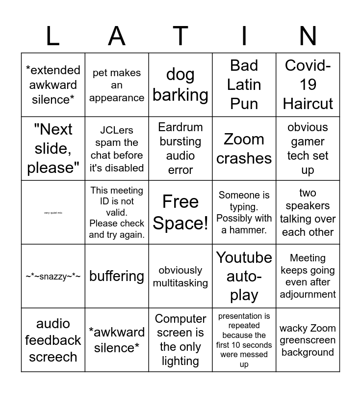 This bingo card has a free space and 34 words: probably wearing pajamas, presentation is repeated because the first 10 seconds were messed up, "I think you're muted", actually wearing business clothes, ~*~snazzy~*~, JCLers spam the chat before it's disabled, Covid-19 Haircut, audio feedback screech, pet makes an appearance, unidentifiable background noise, Eardrum bursting audio error, dog barking, classic iMovie editing, Virtual Tears, Someone is typing. Possibly with a hammer., obvious gamer tech set up, *awkward silence*, very quiet mic, buffering, Youtube auto-play, obviously multitasking, presenter leaves cursor on screen during video, *extended awkward silence*, two speakers talking over each other, Computer screen is the only lighting, wacky Zoom greenscreen background, Bad Latin Pun, Pop culture reference, Zoom crashes, "Next slide, please", Family/pet interruption, This meeting ID is not valid. Please check and try again., Meeting keeps going even after adjournment and "Is it recording?".