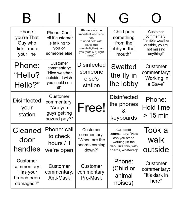 This bingo card has a free space and 28 words: Took a walk outside, Phone: Hold time > 5 min, Swatted the fly in the lobby, Phone: (Child or animal noises), Phone: “Hello? Hello?”, Phone: only the important words cut out “I need help with (cuts out) (unintelligible) can you (cuts out) right now?”, Phone: Can't tell if customer is talking to you or someone else, Cleaned door handles, Disinfected the phones & keyboards, Customer commentary: “Has your branch been damaged?”, Disinfected your station, Child puts something from the lobby in their mouth*, Customer commentary: Anti-Mask, Customer commentary: Pro-Mask, Customer commentary: “Working in a Cave”, Customer nervously sneaks in “Oh I didn’t know if you were open!”, Phone: call to check hours / if we’re open, Customer commentary: “Nice weather outside, I wish you could see it!”, Disinfected someone else’s station, Customer commentary: “When are the boards coming down?”, Phone: you’re That Guy who didn’t mute your line, Customer commentary: “Nice weather outside, I wish you could see it!”, Customer commentary: “It’s dark in here”, Customer commentary: “Are you guys getting hazard pay?”, Phone: Hold time > 15 min, Customer commentary: “How can you stand working [in the dark, like this, with boards, whatever]”, Customer commentary: “Terrible weather outside, you’re not missing anything!” and Learned a new interesting / odd / non-bank-related quirk about a customer.