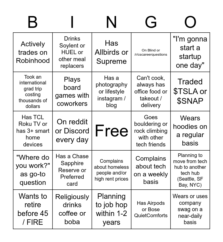 This bingo card has a free space and 24 words: Has a Chase Sapphire Reserve or Preferred card, Religiously drinks coffee or boba, Has a photography or lifestyle instagram / blog, Wants to retire before 45 / FIRE, "I'm gonna start a startup one day", Actively trades on Robinhood, Took an international grad trip costing thousands of dollars, Drinks Soylent or HUEL or other meal replacers, Goes bouldering or rock climbing with other tech friends, Complains about homeless people and/or high rent prices, Can't cook, always has office food or takeout / delivery, Has TCL Roku TV or has 3+ smart home devices, Complains about tech on a weekly basis, Planning to move from tech hub to another tech hub (Seattle, SF Bay, NYC), Plays board games with coworkers, Has Airpods or Bose QuietComforts, Wears hoodies on a regular basis, Has Allbirds or Supreme, Traded $TSLA or $SNAP, On reddit or Discord every day, Wears or uses company swag on a near-daily basis, "Where do you work?" as go-to question, On Blind or /r/cscareerquestions and Planning to job hop within 1-2 years.