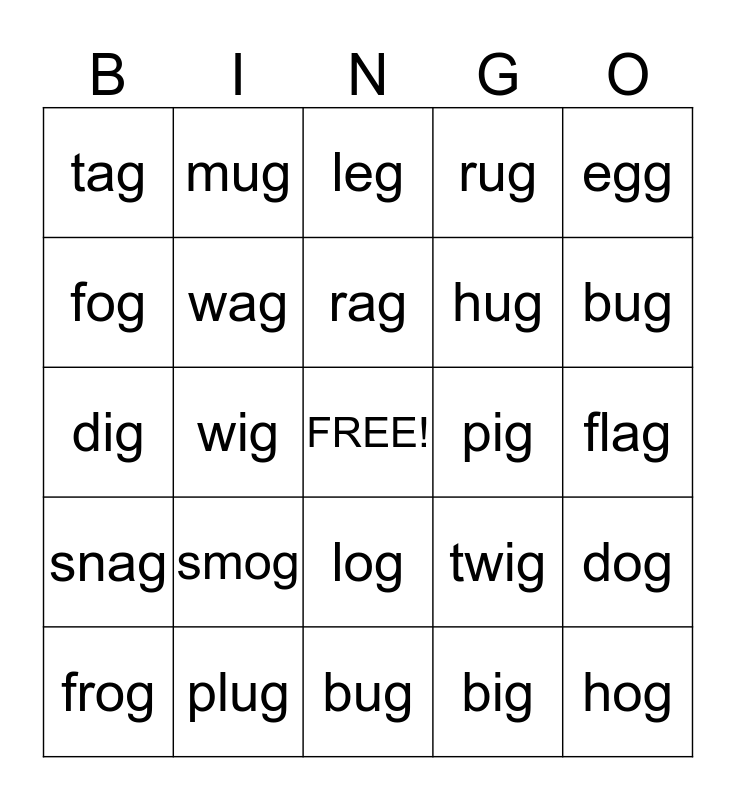 This bingo card has a free space and 24 words: smog, plug, rag, frog, egg, tag, fog, mug, pig, log, hug, dig, twig, dog, wag, big, flag, leg, bug, wig, hog, snag, rug and bug.