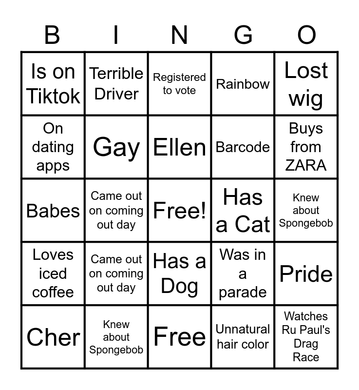 This bingo card has a free space and 24 words: Came out on coming out day, Knew about Spongebob, Ellen, Cher, Lost wig, Is on Tiktok, On dating apps, Terrible Driver, Has a Cat, Has a Dog, Barcode, Babes, Was in a parade, Pride, Gay, Unnatural hair color, Knew about Spongebob, Registered to vote, Buys from ZARA, Came out on coming out day, Watches Ru Paul's Drag Race, Loves iced coffee, Rainbow and Free.