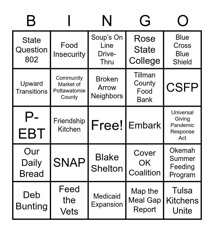 This bingo card has a free space and 45 words: Claire Babineaux-Fontenot, Tulsa Kitchens Unite, Oklahoma Air National Guard, Deb Bunting, Lori Long, Map the Meal Gap Report, Soup’s On Line Drive-Thru, Disaster Household Distribution, Blue Cross Blue Shield, Feed the Vets, Rose State College, Embark, Blake Shelton, SNAP, TEFAP, Medicaid Expansion, CFAP, P-EBT, WIC, CSFP, Food Insecurity, Congresswoman Kendra Horn, State of Senior Hunger in America, State Question 802, Earned Income Tax Credit, Universal Giving Pandemic Response Act, Sen. James Lankford, Food, Research & Action Center, Cover OK Coalition, Our Daily Bread, Christian Help Center, Okemah Summer Feeding Program, Shared Blessings, Donald W. Reynolds Recreation Center, Caring Community Friends, Friendship Kitchen, Moore Food and Resource Center, Hope Center, Restore Hope Ministries, Broken Arrow Neighbors, Upward Transitions, Tillman County Food Bank, Disabled Americans Veterans, Community Market of Pottawatomie County and Iron Gate.