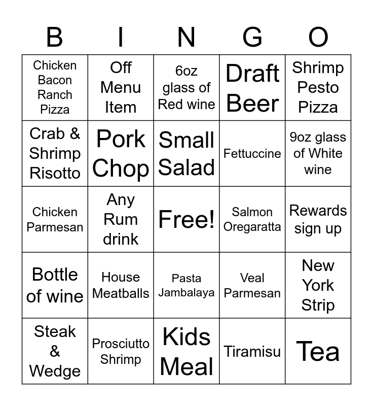 This bingo card has a free space and 24 words: House Meatballs, Prosciutto Shrimp, Small Salad, Steak & Wedge, Shrimp Pesto Pizza, Chicken Bacon Ranch Pizza, Crab & Shrimp Risotto, Off Menu Item, Salmon Oregaratta, Pasta Jambalaya, Fettuccine, Chicken Parmesan, Veal Parmesan, New York Strip, Pork Chop, Tiramisu, Rewards sign up, 6oz glass of Red wine, 9oz glass of White wine, Any Rum drink, Tea, Bottle of wine, Draft Beer and Kids Meal.