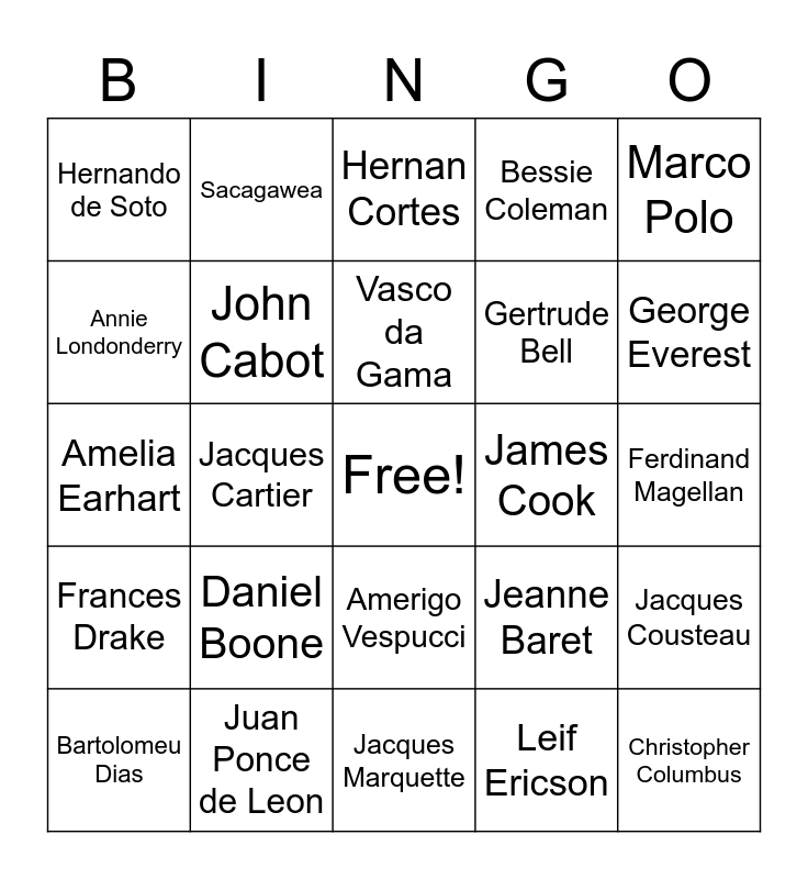 This bingo card has a free space and 29 words: Bartolomeu Dias, Francisco Vázquez de Coronado, Jacques Cartier, Leif Eriksson, Hernando de Soto, Hernan Cortes, John Cabot, Daniel Boone, James Cook, Juan Ponce de Leon, Ferdinand Magellan, Christopher Columbus, Jacques Marquette, Leif Ericson, George Everest, John Cabot, Amerigo Vespucci, Frances Drake, Marco Polo, Amelia Earhart, Jeanne Baret, Nellie Bly, Gertrude Bell, Annie Londonderry, Bessie Coleman, Sacagawea, Jacques Cousteau, Vasco da Gama and Ernest Shackelton.