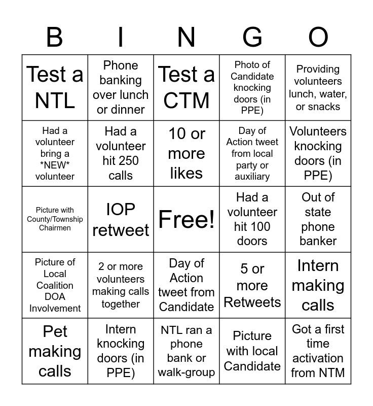 This bingo card has a free space and 24 words: 2 or more volunteers making calls together, Intern knocking doors (in PPE), 10 or more likes, Pet making calls, Providing volunteers lunch, water, or snacks, Test a NTL, Had a volunteer bring a *NEW* volunteer, Phone banking over lunch or dinner, Had a volunteer hit 100 doors, Day of Action tweet from Candidate, Day of Action tweet from local party or auxiliary, Picture with County/Township Chairmen, 5 or more Retweets, Intern making calls, Had a volunteer hit 250 calls, Picture with local Candidate, Out of state phone banker, Test a CTM, Volunteers knocking doors (in PPE), IOP retweet, Got a first time activation from NTM, Picture of Local Coalition DOA Involvement, Photo of Candidate knocking doors (in PPE) and NTL ran a phone bank or walk-group.