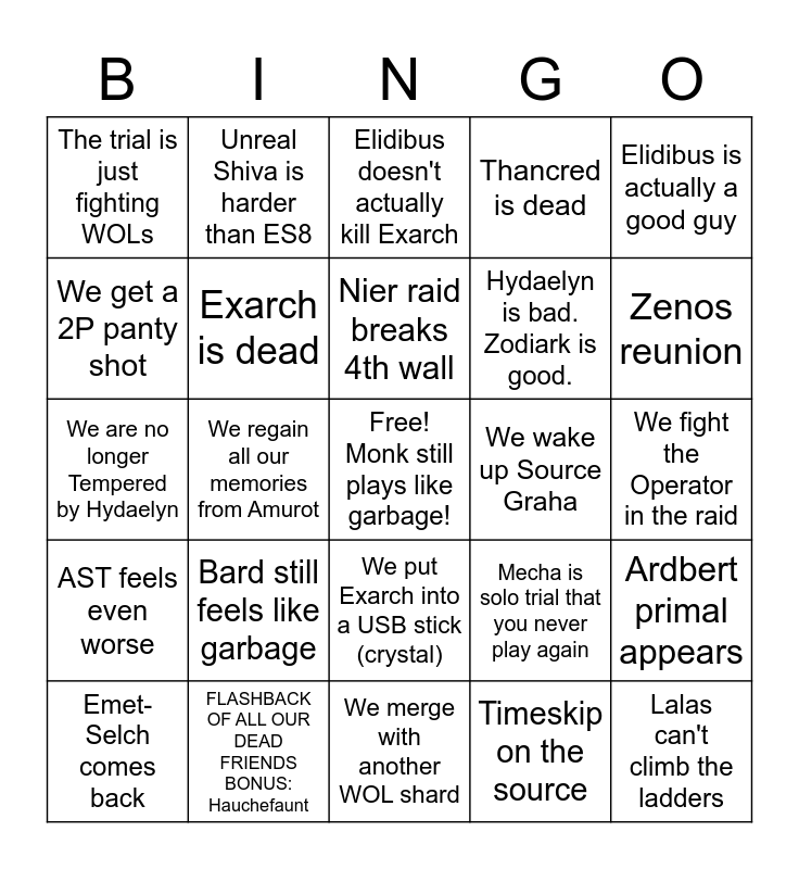 This bingo card has a free space and 24 words: Emet-Selch comes back, Bard still feels like garbage, Nier raid breaks 4th wall, Timeskip on the source, Elidibus is actually a good guy, The trial is just fighting WOLs, Unreal Shiva is harder than ES8, Elidibus doesn't actually kill Exarch, We wake up Source Graha, We fight the Operator in the raid, We are no longer Tempered by Hydaelyn, Exarch is dead, Mecha is solo trial that you never play again, Ardbert primal appears, We get a 2P panty shot, FLASHBACK OF ALL OUR DEAD FRIENDS BONUS: Hauchefaunt, We merge with another WOL shard, Thancred is dead, Zenos reunion, AST feels even worse, We regain all our memories from Amurot, We put Exarch into a USB stick (crystal), Hydaelyn is bad. Zodiark is good. and Lalas can't climb the ladders.