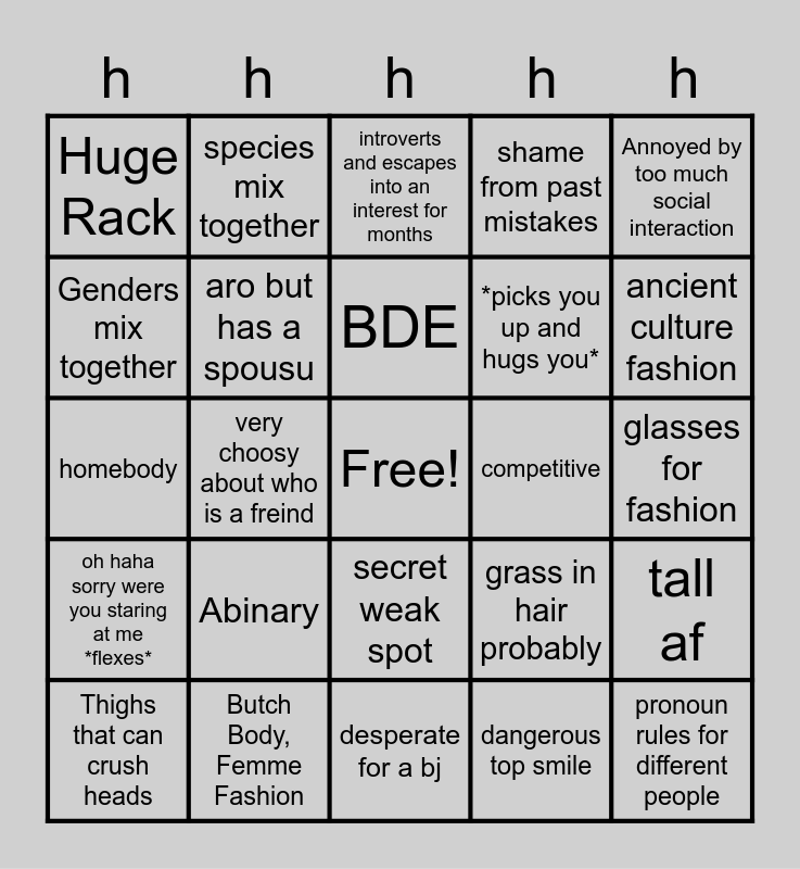 This bingo card has a free space and 24 words: Abinary, Butch Body, Femme Fashion, BDE, Thighs that can crush heads, Annoyed by too much social interaction, Huge Rack, Genders mix together, species mix together, competitive, secret weak spot, *picks you up and hugs you*, homebody, grass in hair probably, tall af, aro but has a spousu, dangerous top smile, glasses for fashion, introverts and escapes into an interest for months, ancient culture fashion, very choosy about who is a freind, pronoun rules for different people, oh haha sorry were you staring at me *flexes*, shame from past mistakes and desperate for a bj.