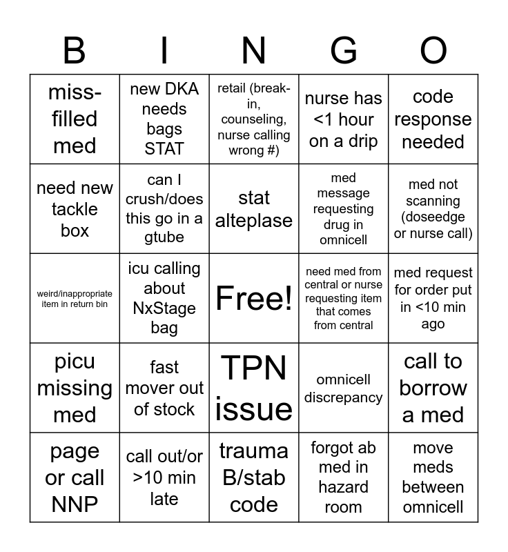 This bingo card has a free space and 40 words: missing lipid/adjust lipid time, weird/inappropriate item in return bin, compatibility question, can I crush/does this go in a gtube, call out/or >10 min late, TPN issue, stat alteplase, new crrt/PD, code response needed, picu missing med, icu calling about NxStage bag, nurse has <1 hour on a drip, move meds between omnicell, med request for order put in <10 min ago, need med from central or nurse requesting item that comes from central, fast mover out of stock, tube station down, miss-filled med, page on call, retail (break-in, counseling, nurse calling wrong #), call to borrow a med, forgot ab med in hazard room, med message requesting drug in omnicell, need new tackle box, large med spill during cart fill, missing drip list, L&D need epidurals, expired med or compound, smog compound, new chemo/chemo issue, premix station with >10 to prep, page or call NNP, rec from a consult service, omnicell discrepancy, med not scanning (doseedge or nurse call), trauma B/stab code, expired med (not compound), call from OR, new DKA needs bags STAT and calling maintenance or environmental services.
