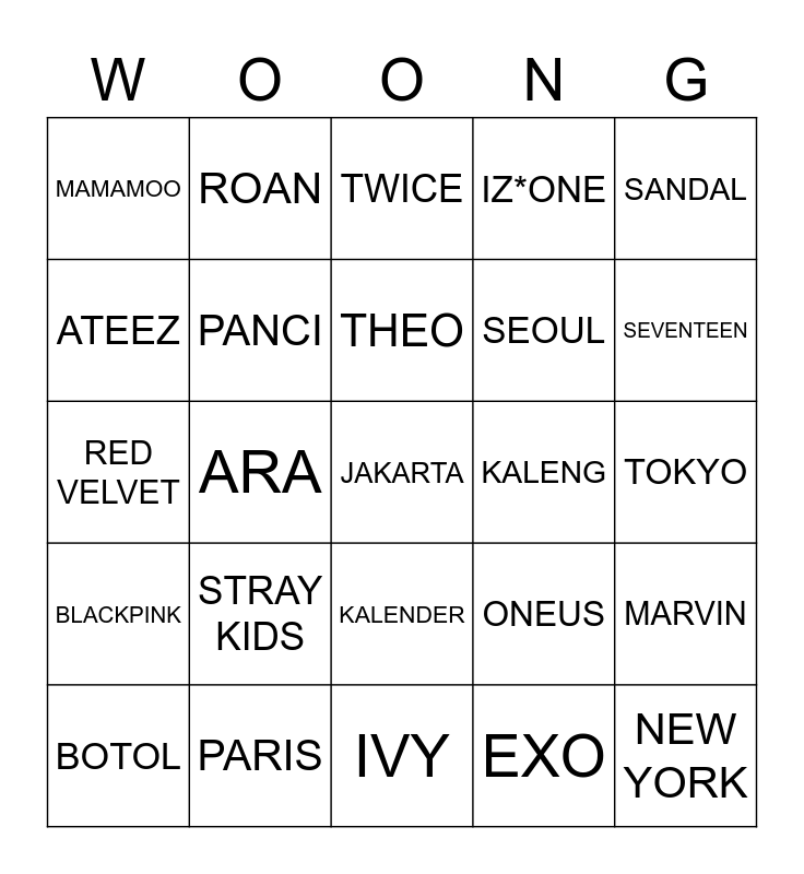 This bingo card has 25 words: STRAY KIDS, IVY, THEO, BOTOL, SANDAL, MAMAMOO, ATEEZ, ROAN, KALENG, KALENDER, SEOUL, RED VELVET, ONEUS, MARVIN, PANCI, NEW YORK, TOKYO, TWICE, SEVENTEEN, ARA, JAKARTA, PARIS, BLACKPINK, IZ*ONE and EXO.