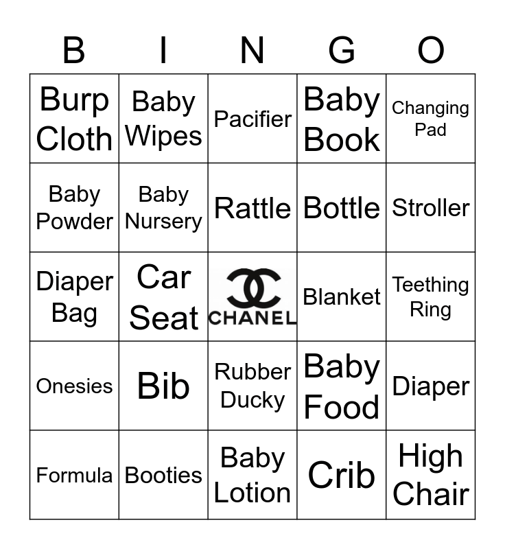 This bingo card has a free space and 24 words: Bib, Booties, Rattle, Formula, Changing Pad, Burp Cloth, Baby Powder, Baby Wipes, Blanket, Rubber Ducky, Bottle, Diaper Bag, Baby Food, Diaper, Baby Nursery, Crib, Teething Ring, Pacifier, Stroller, Car Seat, High Chair, Onesies, Baby Book and Baby Lotion.