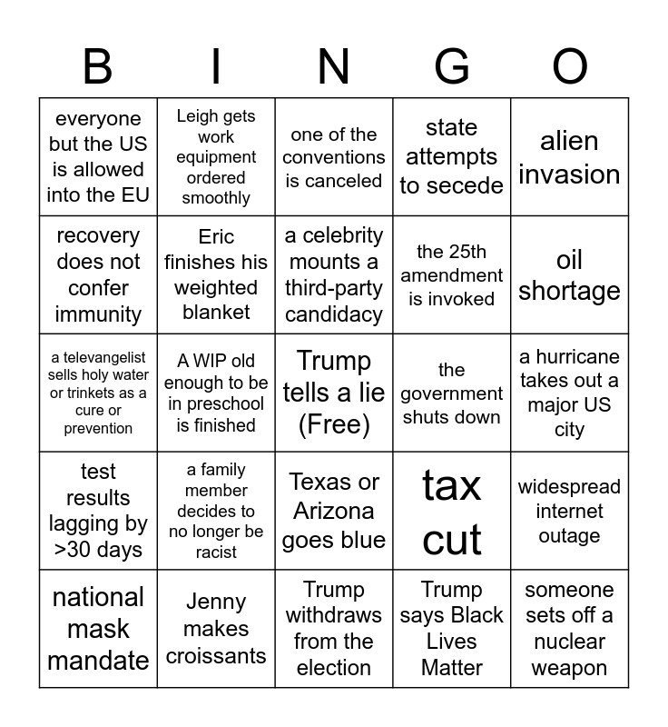 This bingo card has a free space and 74 words: Jared Kushner is put in charge of the coronavirus response, Anastasia finishes a pair of socks, a celebrity mounts a third-party candidacy, Rand Paul says something we agree with, a human dies of the plague, return to Phase 1 lockdown, Lindsey finishes a a hand-knitting project, Melania files for divorce, Kentucky kicks out McConnell, shark kills someone, national mask mandate, Weezie has an empty project bag, the 25th amendment is invoked, alien invasion, Betsy DeVos argues for closing schools, Jenny makes croissants, Electoral College shenanigans, the government shuts down, God personally intervenes, everyone but the US is allowed into the EU, A WIP old enough to be in preschool is finished, one of the conventions is canceled, state attempts to secede, a hurricane takes out a major US city, recovery does not confer immunity, someone frogs a WIP old enough to be in preschool, Trump wins reelection, news about RBG's health, terrorist attack in the US, someone develops a vaccine that works, Eric finishes his weighted blanket, Biden wins with more than a 10% margin, a conservative Supreme Court Justice retires, US declares war against someone or something, Trump gets coronavirus, someone gets pregnant, the election is done entirely by mail-in ballot, Clarence Thomas says something in court, someone sets off a nuclear weapon, Trump promotes a treatment with no scientific backing, Hannah starts learning how to spin, Texas or Arizona goes blue, student loans are forgiven, the animals take over, Trump promises a vaccine by fall, Leigh gets work equipment ordered smoothly, the election goes to the House, McConnell blocks a bill that only he is against, another country leaves the EU, testing centers closed, one of us gets arrested at a protest, a 3rd party candidate gets an electoral vote, tax cut, something happens to the moon, proof that the White House is doctoring the numbers, in-person knit night, Trump withdraws from the election, Trump resigns, Sarah Palin, test results lagging by >30 days, a family member decides to no longer be racist, either Trump or Biden dies, Trump says Black Lives Matter, widespread internet outage, a televangelist sells holy water or trinkets as a cure or prevention, someone quits their job, brokered convention, a cop is convicted of murdering a black or brown person, oil shortage, Trump fires Fauci, epic yarn knot, election day does not take place as scheduled, Breonna Taylor's murderers are indicted and gas prices go under $1/gallon.