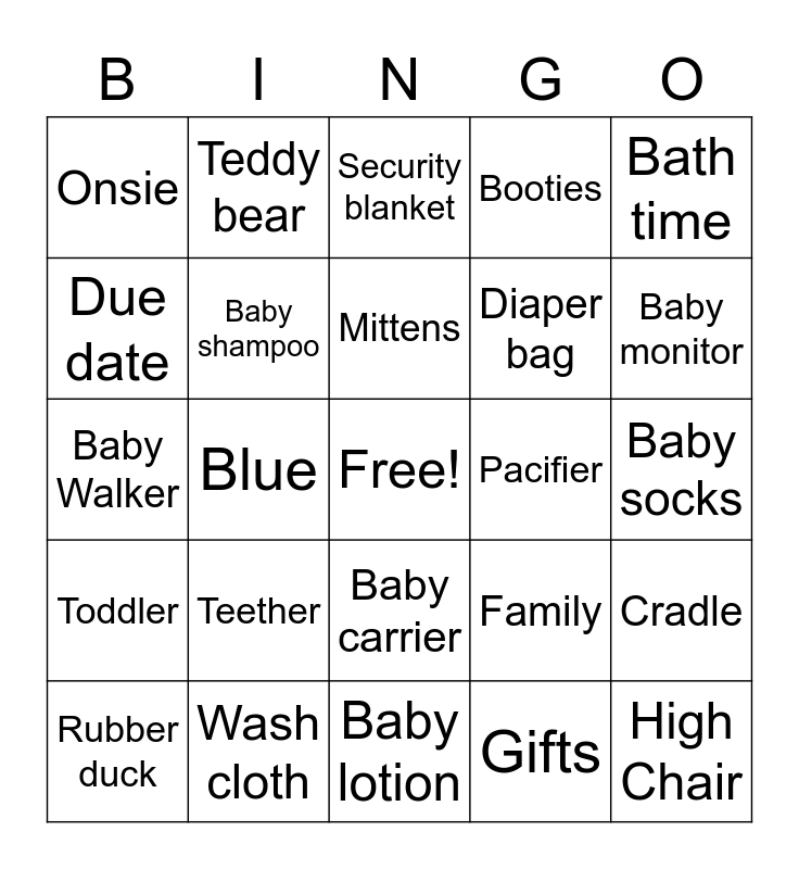 This bingo card has a free space and 40 words: Sippy cup, Baby Walker, Diapers, Baby shampoo, Wash cloth, Baby carrier, Mittens, Nursery Rhyme, Bath time, Toddler, Blue, Booties, High Chair, Baby socks, Pacifier, Teether, Burp cloth, Onsie, Lullby, Security blanket, Cradle, Gifts, Diaper bag, Due date, Newborn, Rattle, Playpen, Wipes, Blankie, Naptime, Teething ring, Rubber duck, Baby food, Family, Baby monitor, Baby lotion, Baby bathtub, Stroller, Teddy bear and Basinet.