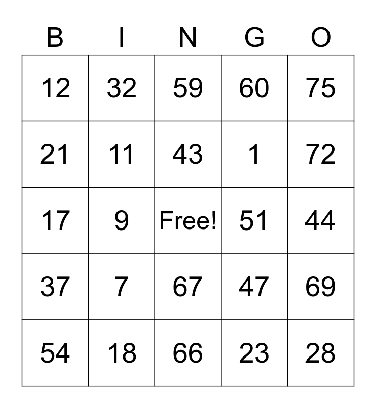 This bingo card has a free space and 24 words: 7, 18, 43, 54, 75, 12, 21, 32, 51, 67, 1, 17, 47, 69, 11, 23, 44, 59, 72, 9, 28, 37, 60 and 66.