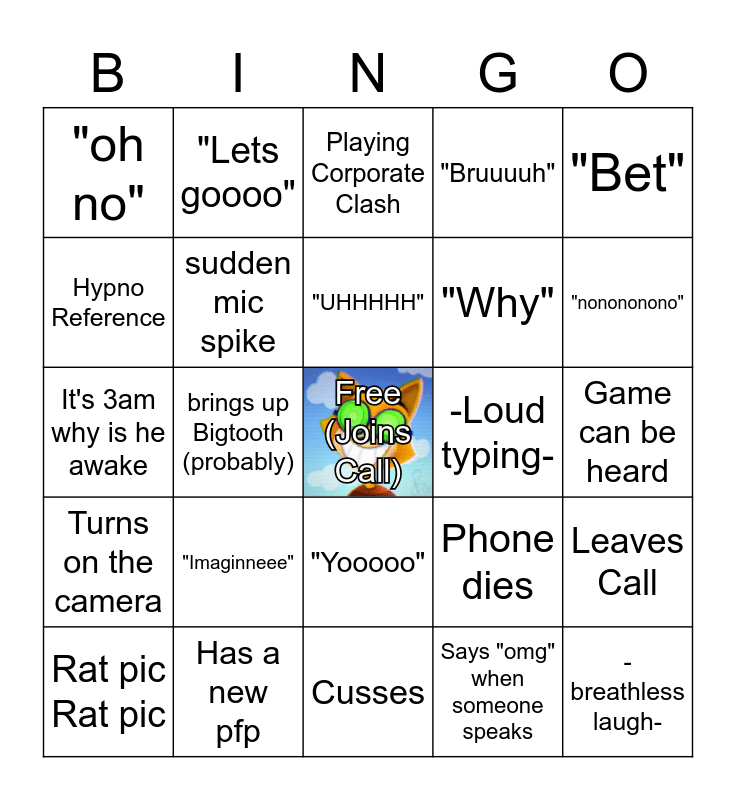 This bingo card has a free space and 24 words: Rat pic Rat pic, "Imaginneee", "UHHHHH", Says "omg" when someone speaks, "Bet", "oh no", "Lets goooo", Playing Corporate Clash, -Loud typing-, Game can be heard, It's 3am why is he awake, sudden mic spike, Phone dies, Leaves Call, Hypno Reference, Has a new pfp, Cusses, "Bruuuuh", "nonononono", Turns on the camera, brings up Bigtooth (probably), "Yooooo", "Why" and -breathless laugh-.