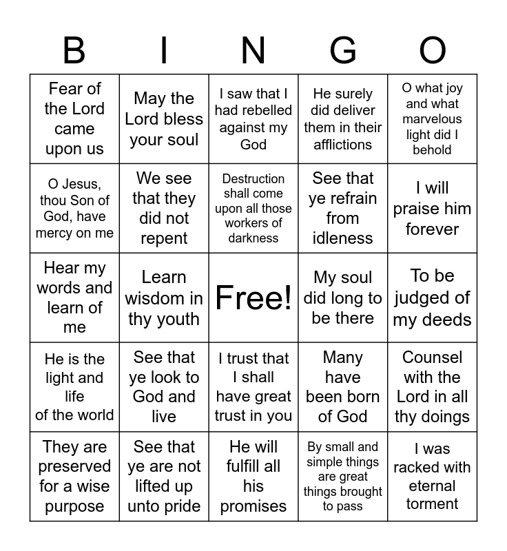 This bingo card has a free space and 35 words: Ye shall prosper in the land, To atone for the sins of the world, Keep a record of this people, We see that they did not repent, I trust that I shall have great trust in you, He surely did deliver them in their afflictions, O Jesus, thou Son of God, have mercy on me, They shall know of the mysteries contained thereon, Destruction shall come upon all those workers of darkness, Thou didst bear all these things with patience, Hear my words and learn of me, O what joy and what marvelous light did I behold, Teach them an everlasting hatred against sin and iniquity, I did find peace to my soul, Fear of the Lord came upon us, My soul did long to be there, By small and simple things are great things brought to pass, Learn wisdom in thy youth, He is the light and life of the world, I was racked with eternal torment, Many have been born of God, They are preserved for a wise purpose, Counsel with the Lord in all thy doings, See that ye are not lifted up unto pride, I saw that I had rebelled against my God, I will praise him forever, How strict are the commandments of God, Therefore they had this miracle, See that ye refrain from idleness, To be judged of my deeds, I have always retained in remembrance their captivity, He will fulfill all his promises, See that ye look to God and live, May the Lord bless your soul and If they did not repent, they should be destroyed.