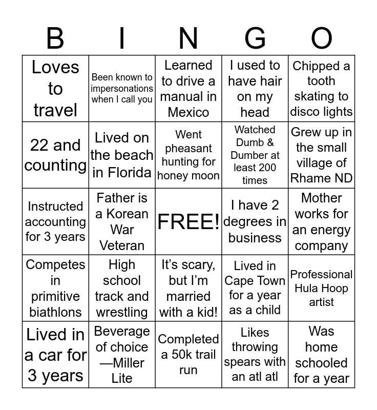 This bingo card has a free space and 24 words: High school track and wrestling, Beverage of choice—Miller Lite, Went pheasant hunting for honey moon, Lived in a car for 3 years, Chipped a tooth skating to disco lights, Loves to travel, 22 and counting, Been known to impersonations when I call you, I have 2 degrees in business, It’s scary, but I’m married with a kid!, Watched Dumb & Dumber at least 200 times, Instructed accounting for 3 years, Lived in Cape Town for a year as a child, Professional Hula Hoop artist, Lived on the beach in Florida, Likes throwing spears with an atl atl, Mother works for an energy company, Learned to drive a manual in Mexico, Grew up in the small village of Rhame ND, Father is a Korean War Veteran, Was home schooled for a year, Competes in primitive biathlons, I used to have hair on my head and Completed a 50k trail run.
