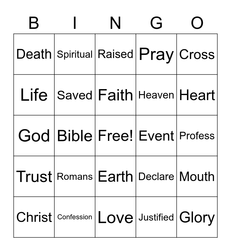 This bingo card has a free space and 24 words: Romans, Confession, Faith, Christ, Cross, Death, Life, Spiritual, Event, Earth, Heaven, God, Declare, Mouth, Saved, Justified, Profess, Raised, Heart, Bible, Glory, Trust, Pray and Love.