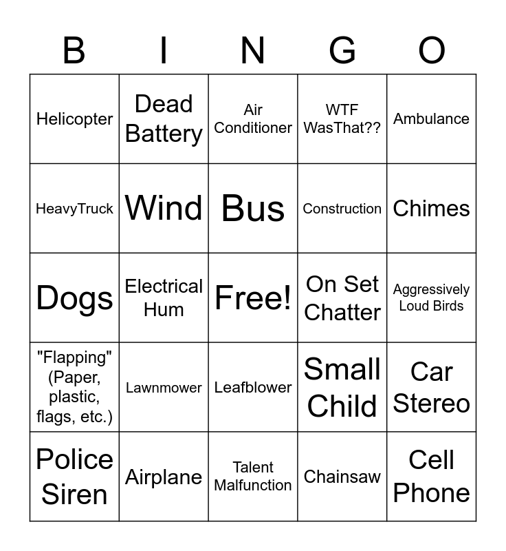 This bingo card has a free space and 24 words: Lawnmower, Airplane, Bus, Police Siren, Ambulance, Helicopter, HeavyTruck, Dead Battery, On Set Chatter, Leafblower, Construction, Dogs, Small Child, Car Stereo, Wind, Chainsaw, Aggressively Loud Birds, Air Conditioner, Chimes, Electrical Hum, Cell Phone, "Flapping" (Paper, plastic, flags, etc.), WTF WasThat?? and Talent Malfunction.