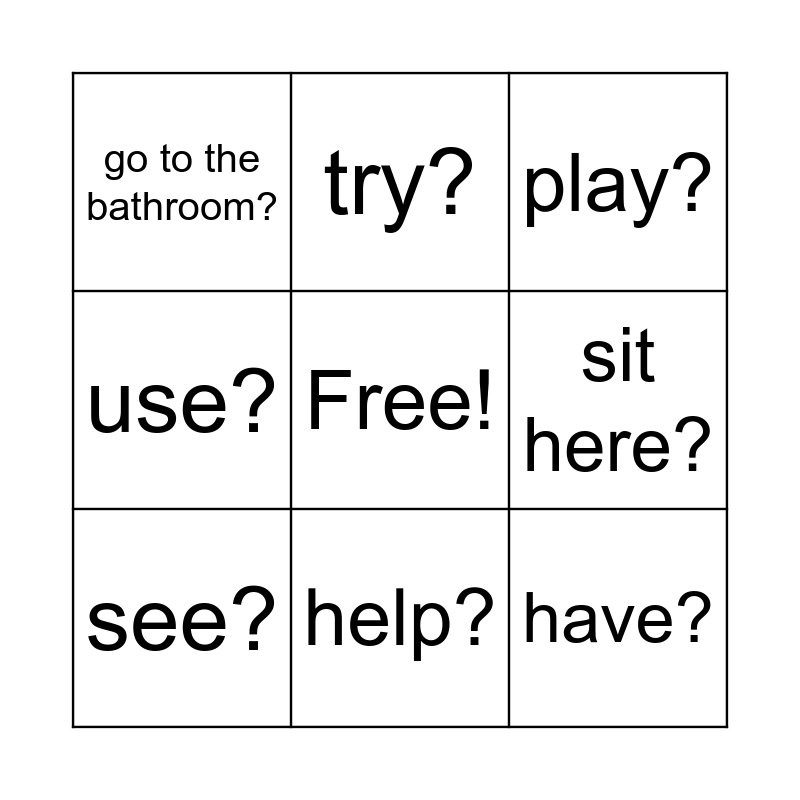This bingo card has a free space and 8 words: sit here?, play?, try?, see?, go to the bathroom?, have?, use? and help?.
