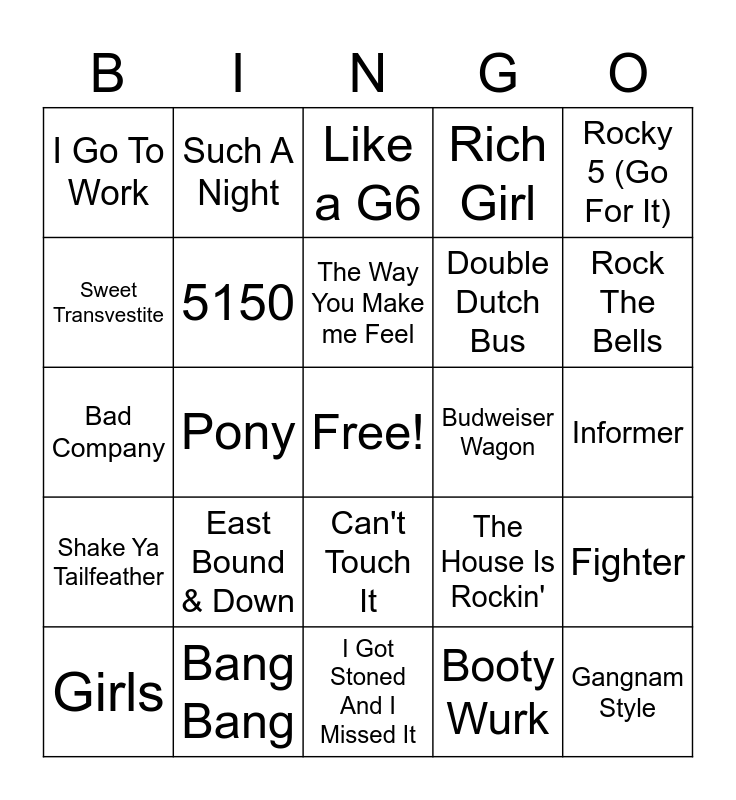 This bingo card has a free space and 35 words: Go Cubs Go, I'm A Believer, Any Way You Want It, 5150, Can't Touch It, Rich Girl, Sweet Transvestite, 4 Minutes, The Way You Make me Feel, Whooty, Bad Company, Rocky 5 (Go For It), Everything About You, Nookie, I Go To Work, Budweiser Wagon, Booty Wurk, Pony, Shake Ya Tailfeather, Gangnam Style, The House Is Rockin', Girls, Fighter, Bang Bang, Like a G6, Rock The Bells, Zoot Suit Riot, I Wanna Be Sedated, Double Dutch Bus, Informer, Blaze Of Glory, I Got Stoned And I Missed It, East Bound & Down, Such A Night and Stay The Night.