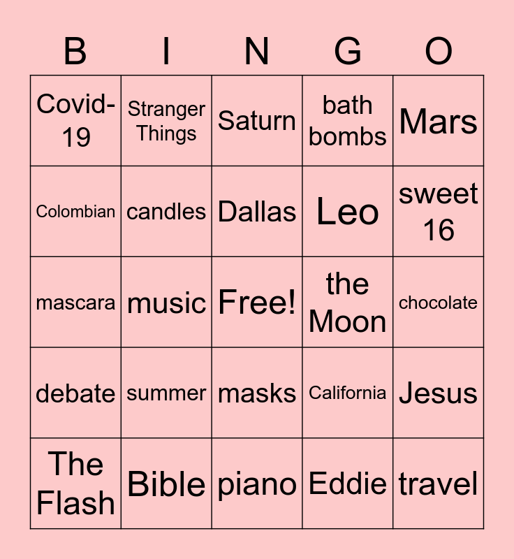 This bingo card has a free space and 43 words: tennis, music, Taylor Swift, Ariana Grande, Arrow, The Flash, Stranger Things, Texas, Leo, Jesus, Colombian, summer, piano, Eddie, purple, debate, July 23, Dallas, drivers license, sweet 16, Covid-19, quarantine, masks, bath bombs, makeup, mascara, shopping, fashion, photos, chocolate, sweet tooth, Bible, lipstick, California, travel, driving, N.A.S.A., Saturn, the Moon, Mars, Jupiter, candles and birthday girl.
