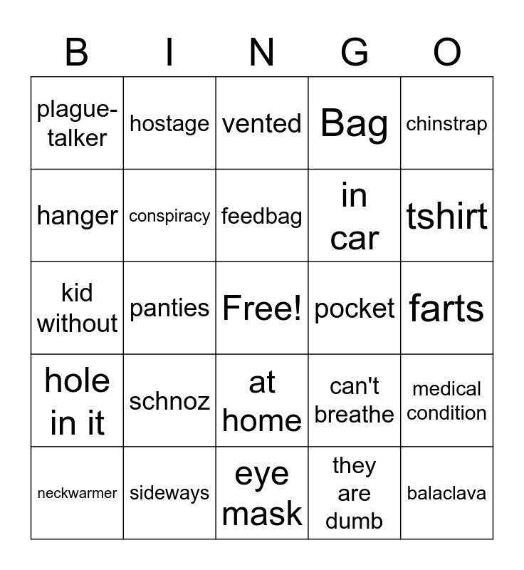 This bingo card has a free space and 24 words: schnoz, sideways, feedbag, neckwarmer, chinstrap, plague-talker, hanger, hostage, pocket, at home, in car, kid without, can't breathe, medical condition, conspiracy, they are dumb, farts, vented, tshirt, panties, balaclava, hole in it, Bag and eye mask.