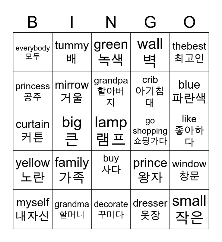 This bingo card has a free space and 24 words: family 가족, grandma 할머니, grandpa 할아버지, myself 내자신, thebest최고인, everybody 모두, princess 공주, tummy 배, go shopping 쇼핑가다, buy 사다, crib 아기침대, curtain 커튼, prince 왕자, window 창문, mirrow 거울, dresser 옷장, like 좋아하다, green 녹색, blue 파란색, big 큰, small 작은, yellow 노란, wall 벽 and decorate 꾸미다.