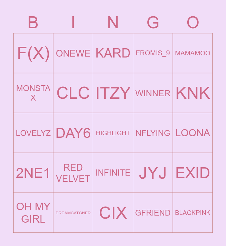 This bingo card has 25 words: 2NE1, DREAMCATCHER, HIGHLIGHT, GFRIEND, MAMAMOO, F(X), ONEWE, KARD, NFLYING, EXID, MONSTA X, CLC, CIX, JYJ, KNK, OH MY GIRL, DAY6, ITZY, WINNER, LOONA, LOVELYZ, RED VELVET, INFINITE, FROMIS_9 and BLACKPINK.
