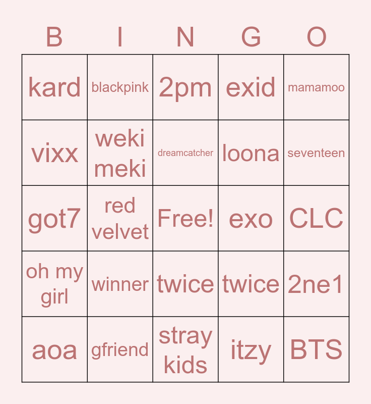 This bingo card has a free space and 24 words: winner, gfriend, dreamcatcher, aoa, mamamoo, kard, vixx, blackpink, exo, twice, loona, got7, twice, 2ne1, weki meki, itzy, CLC, 2pm, seventeen, red velvet, BTS, oh my girl, exid and stray kids.