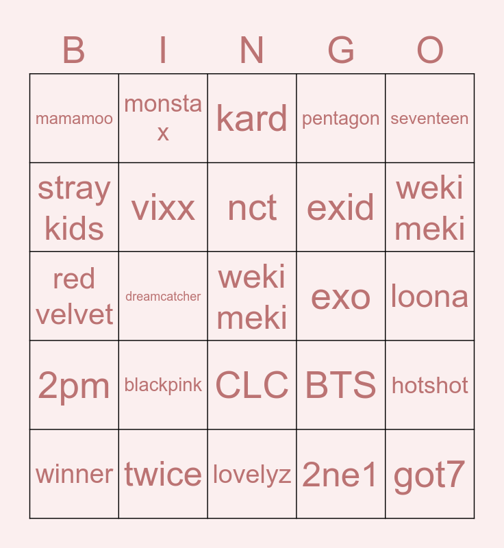 This bingo card has a free space and 29 words: winner, gfriend, dreamcatcher, aoa, mamamoo, kard, vixx, blackpink, exo, twice, loona, got7, lovelyz, 2ne1, weki meki, itzy, CLC, 2pm, seventeen, red velvet, BTS, oh my girl, exid, stray kids, pentagon, monsta x, hotshot, nct and ze:a.