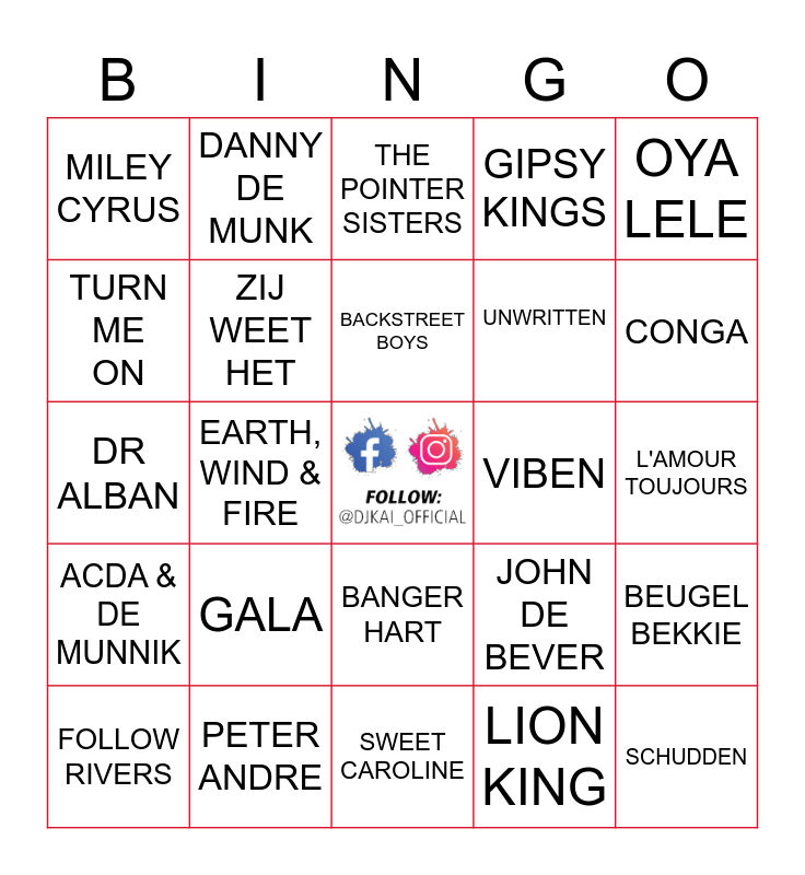 This bingo card has a free space and 49 words: TOREADOR, SCHUDDEN, LOU BEGA, SWEET CAROLINE, GALA, GREASE, DANNY DE MUNK, SPICE GIRLS, TURN ME ON, DANCING QUEEN, ZIJ WEET HET, GIPSY KINGS, BEUGEL BEKKIE, JOHN DE BEVER, AFRICA, CRAZY IN LOVE, BACKSTREET BOYS, VIBEN, A THOUSAND MILES, OYA LELE, EARTH, WIND & FIRE, LION KING, MILEY CYRUS, UNWRITTEN, UPTOWN FUNK, CONGA, FOLLOW RIVERS, JOLENE, BANGER HART, ACDA & DE MUNNIK, VALERIE, JEUGD VAN TEGENWOORDIG, Corona, ROBBIE WILLIAMS, PETER ANDRE, ATOMIC KITTEN, SHAGGY, WHAT IS LOVE, L'AMOUR TOUJOURS, SUMMER JAM, WESTLIFE, RELIGHT MY FIRE, THE HUMAN LEAGUE, KERNKRAFT 400, DR ALBAN, THE POINTER SISTERS, YMCA, WHITNEY HOUSTON and ACE OF BASE.
