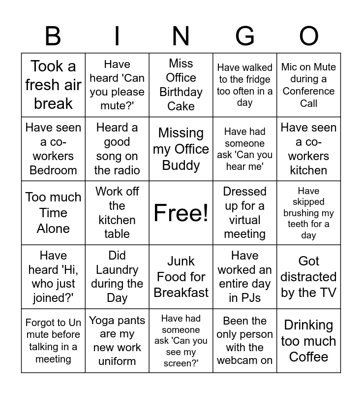 This bingo card has a free space and 24 words: Did Laundry during the Day, Yoga pants are my new work uniform, Missing my Office Buddy, Forgot to Un mute before talking in a meeting, Mic on Mute during a Conference Call, Took a fresh air break, Have seen a co-workers Bedroom, Have heard 'Can you please mute?', Dressed up for a virtual meeting, Junk Food for Breakfast, Have had someone ask 'Can you hear me', Too much Time Alone, Have worked an entire day in PJs, Got distracted by the TV, Heard a good song on the radio, Been the only person with the webcam on, Have skipped brushing my teeth for a day, Miss Office Birthday Cake, Have seen a co-workers kitchen, Work off the kitchen table, Drinking too much Coffee, Have heard 'Hi, who just joined?', Have walked to the fridge too often in a day and Have had someone ask 'Can you see my screen?'.