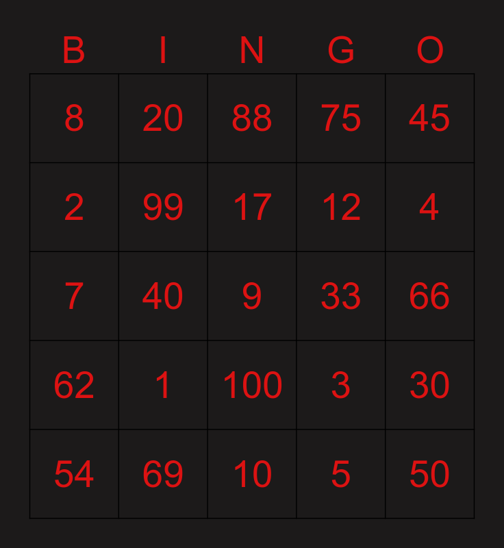 This bingo card has 25 words: 1, 10, 17, 54, 45, 8, 2, 20, 33, 100, 12, 7, 3, 30, 99, 50, 66, 88, 4, 40, 9, 69, 62, 75 and 5.