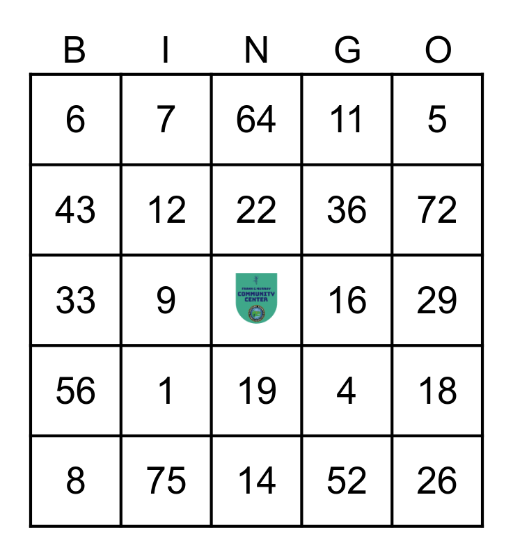 This bingo card has a free space and 24 words: 1, 75, 22, 8, 5, 6, 43, 7, 16, 19, 36, 33, 4, 18, 12, 52, 29, 64, 72, 9, 26, 56, 11 and 14.