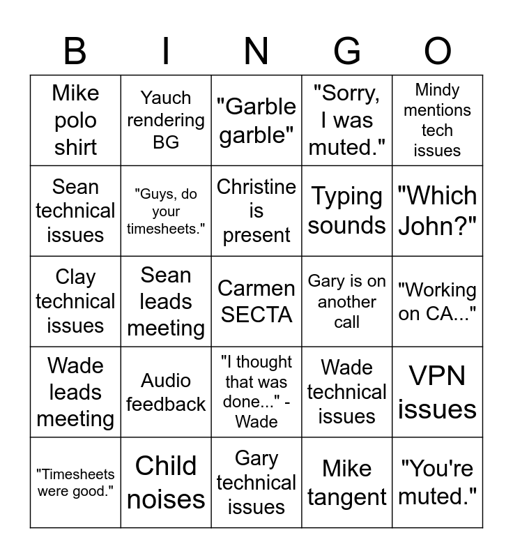 This bingo card has a free space and 39 words: Alphabetical order, Reverse alphabetical order, Random order, "Guys, do your timesheets.", "Timesheets were good.", "I thought that was done..." - Wade, Christine is present, No Christine, Mindy mentions tech issues, Wade leads meeting, Sean leads meeting, "Sorry, I was muted.", "You're muted.", "Working on CA...", Gary is on another call, Audio feedback, Mike Hawaiian shirt, Mike polo shirt, Boomer brown nosing, Wade technical issues, Sean technical issues, Gary technical issues, Typing sounds, "Which John?", "Which Sean?", "We'll get back to you...", "Is ___ there?", Dad joke, Aggro Yauch, Yauch rendering BG, "Can you hear me?", "AFFs and CAFs", "Garble garble", Child noises, Mike tangent, Carlos tangent, VPN issues, Clay technical issues and "Stimulus".