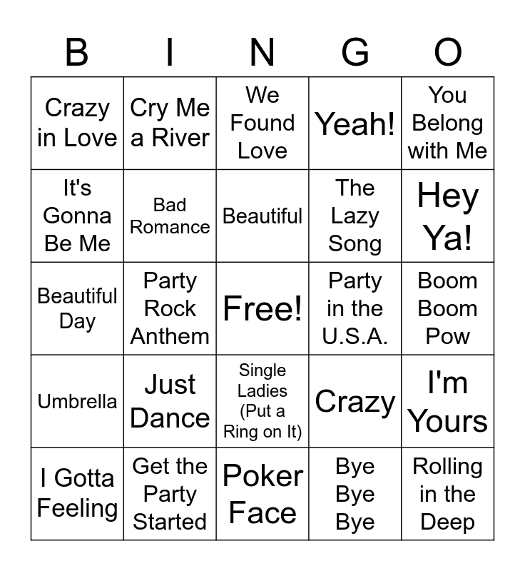 This bingo card has a free space and 24 words: Just Dance, Get the Party Started, Beautiful, I Gotta Feeling, You Belong with Me, Crazy in Love, It's Gonna Be Me, Cry Me a River, Party in the U.S.A., Single Ladies (Put a Ring on It), The Lazy Song, Beautiful Day, Crazy, I'm Yours, Bad Romance, Bye Bye Bye, Boom Boom Pow, We Found Love, Hey Ya!, Party Rock Anthem, Rolling in the Deep, Umbrella, Yeah! and Poker Face.