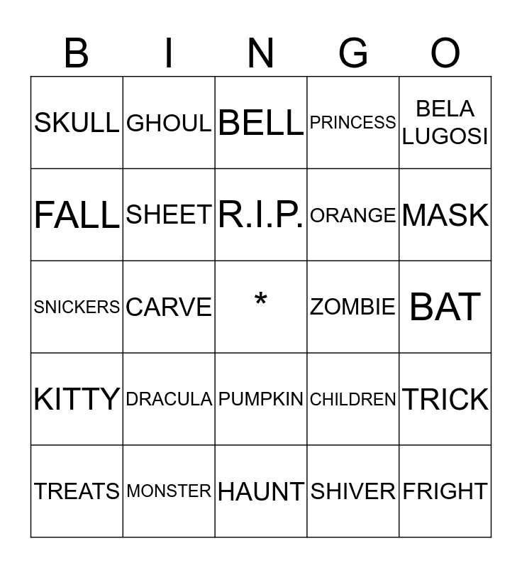 This bingo card has a free space and 24 words: DRACULA, MONSTER, R.I.P., TREATS, BELA LUGOSI, SKULL, FALL, GHOUL, ZOMBIE, PUMPKIN, ORANGE, SNICKERS, CHILDREN, TRICK, SHEET, SHIVER, BAT, BELL, MASK, CARVE, FRIGHT, KITTY, PRINCESS and HAUNT.