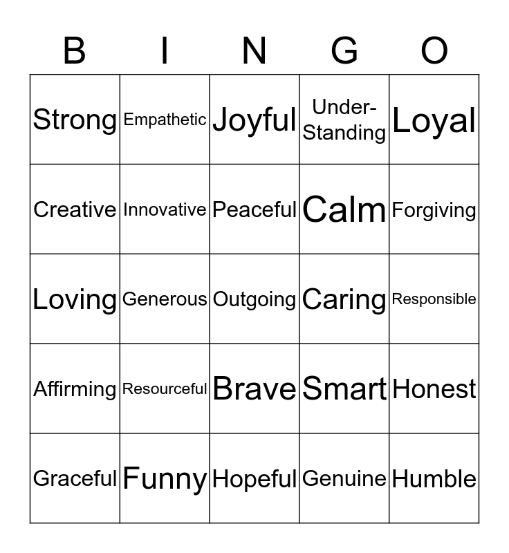 This bingo card has a free space and 24 words: Resourceful, Funny, Peaceful, Graceful, Loyal, Strong, Creative, Empathetic, Caring, Brave, Calm, Loving, Smart, Honest, Innovative, Genuine, Responsible, Joyful, Forgiving, Generous, Humble, Affirming, Under- Standing and Hopeful.